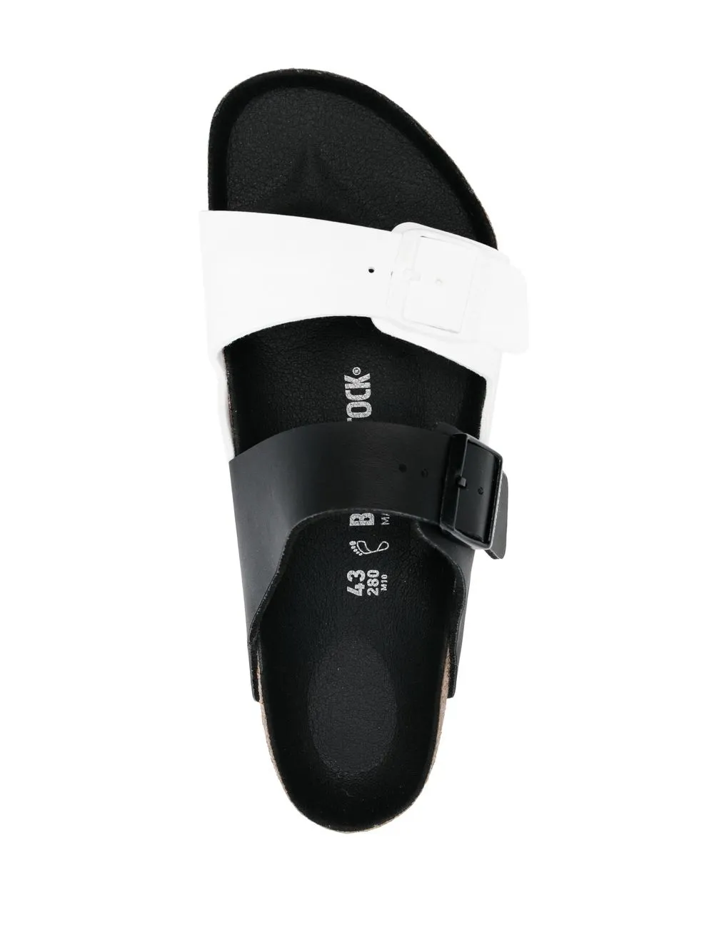 Arizona colour-block slides from BIRKENSTOCK featuring black/white, calf leather, colour-block design, open toe, side buckle fastening, slip-on style, branded insole and flat rubber sole.