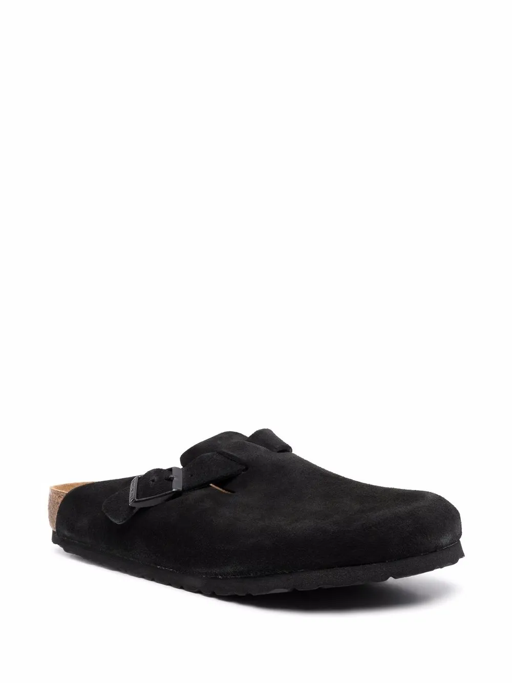 Black suede/leather Boston clog slip-on shoes from BIRKENSTOCK featuring round toe, buckle fastening, slip-on style, moulded footbed and flat sole.