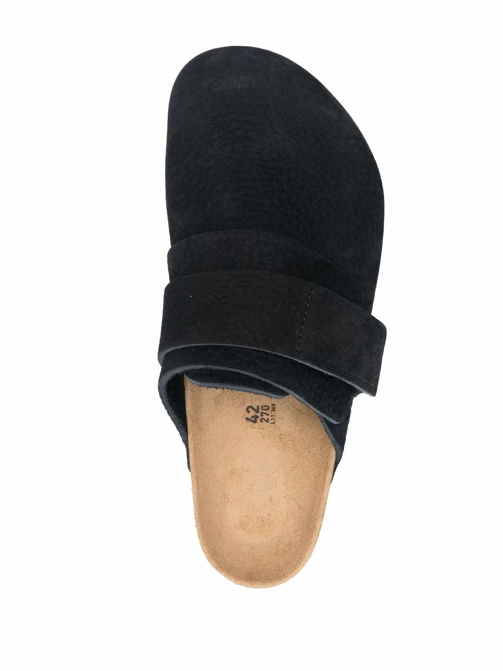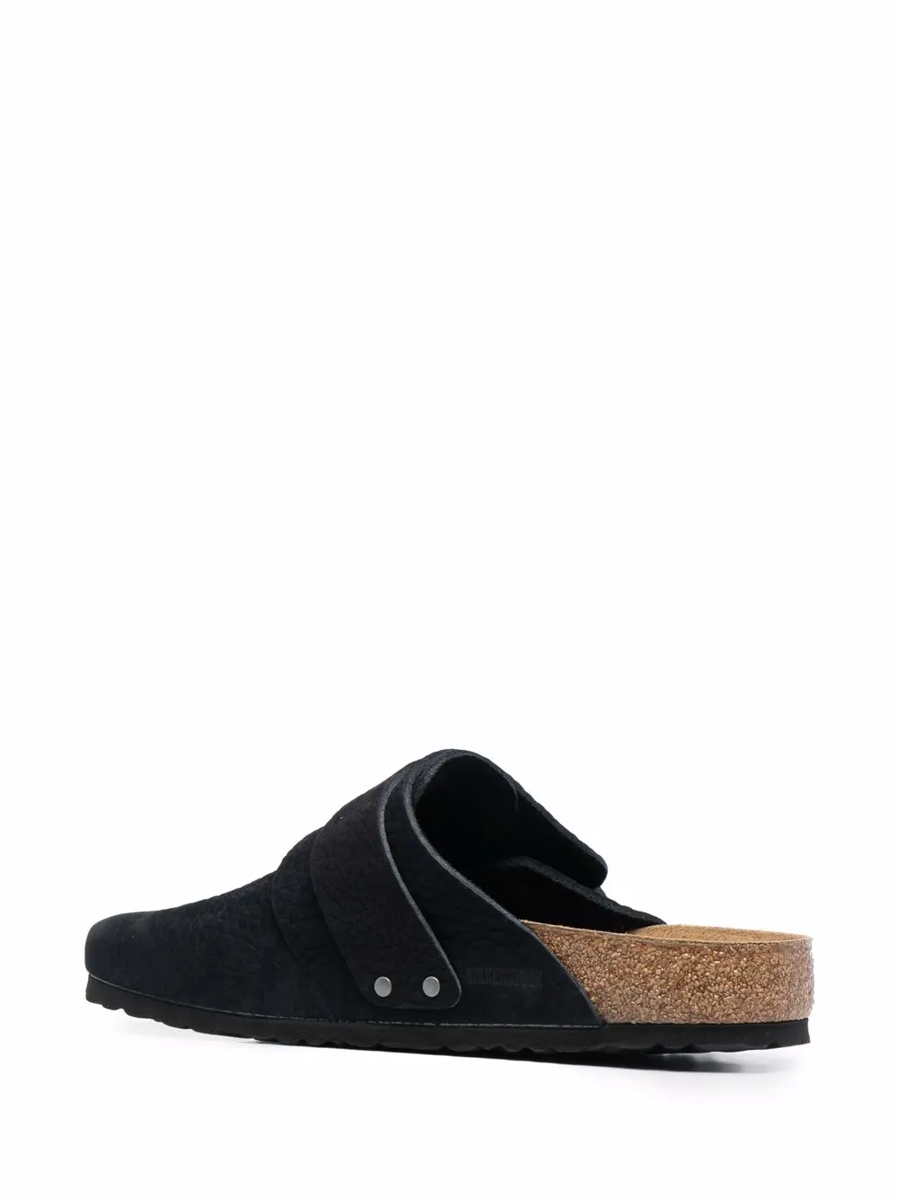 Desert black leather Boston touch-strap clogs from BIRKENSTOCK featuring round toe, front touch-strap fastening, slip-on style and flat rubber sole.