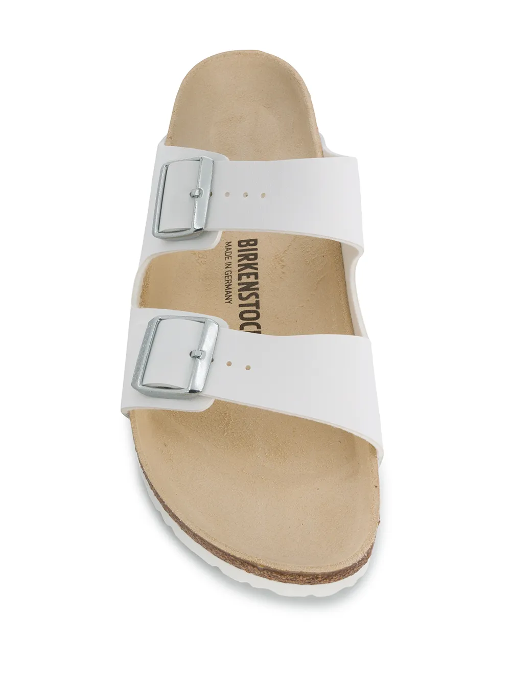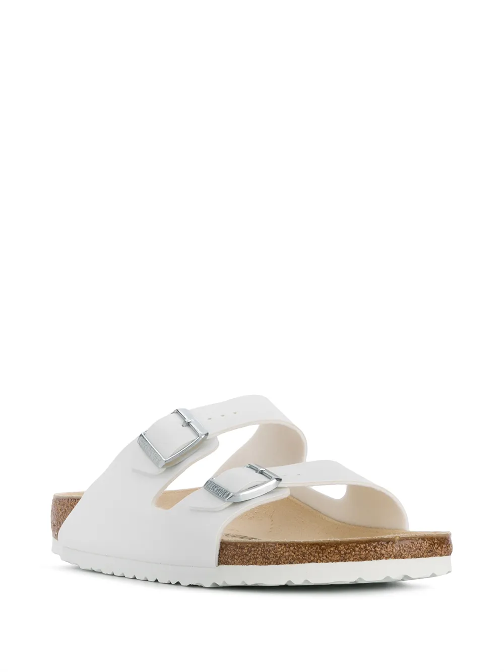 White buckle-embellished slides from Birkenstock featuring an open toe, buckle details, a slip-on style, a branded insole and a ridged rubber sole.
