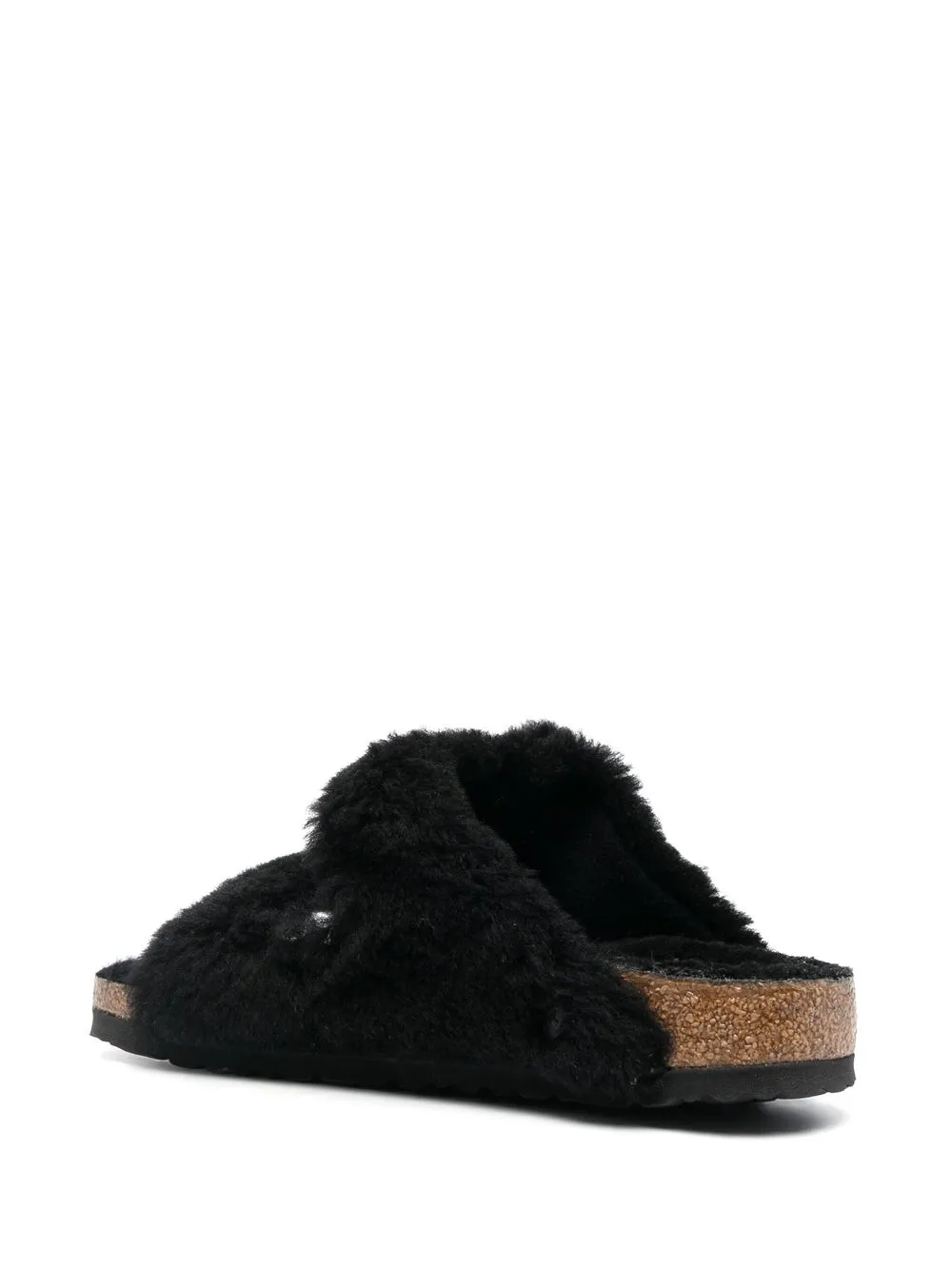 Arizona Big Buckle sandals from BIRKENSTOCK featuring jet black, shearling, double-strap design, open toe, double buckle fastening, open back, EVA midsole and flat sole.