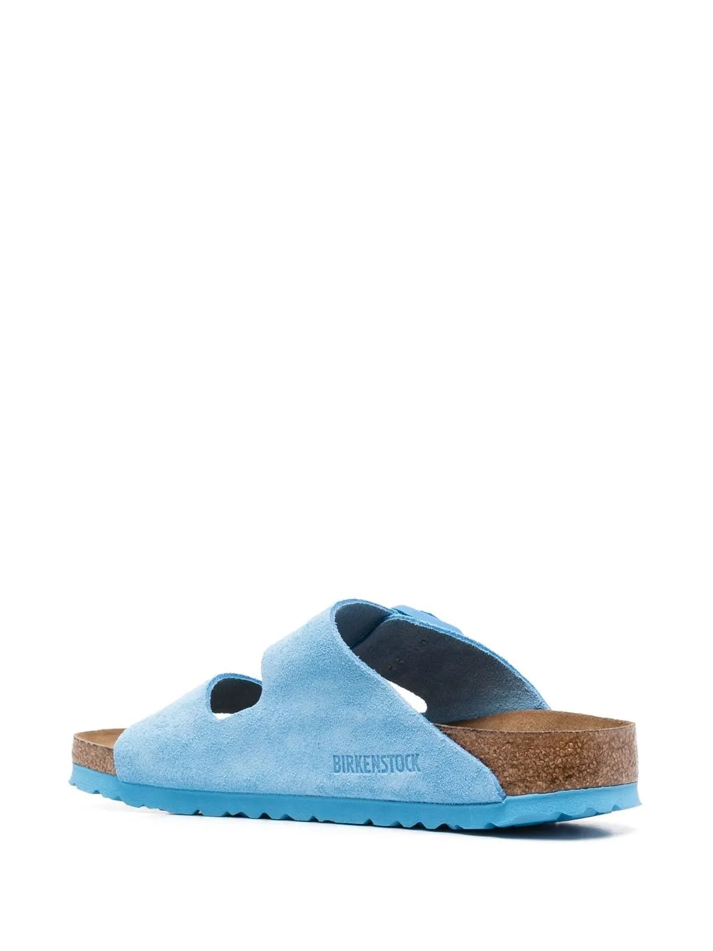 Arizona double-buckle slide sandals from BIRKENSTOCK featuring sky blue, calf suede, double buckle fastening, tonal hardware, open toe, moulded footbed, branded insole, flat rubber sole and slip-on style.
