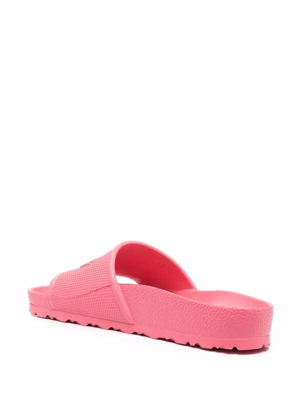 Pink rubber Barbados logo slides from BIRKENSTOCK featuring embossed logo to the front, open toe and flat sole.