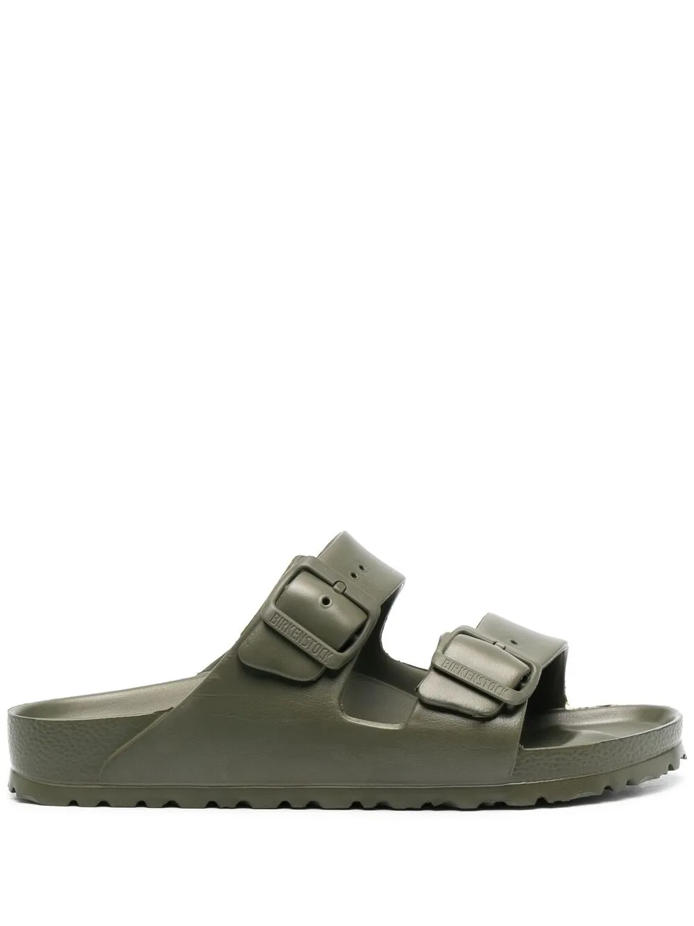 Military-green eco leather Eva eco leather sandals from BIRKENSTOCK featuring open toe, double buckle fastening, slip-on style, branded insole, moulded footbed and flat rubber sole. POSITIVELY CONSCIOUS: At least 50% of the main material of this product meets our conscious criteria. For example, it’s either organic, recycled, upcycled or independently recognised as being better for the environment (such as linen, ramie, TENCELโข etc.)..
