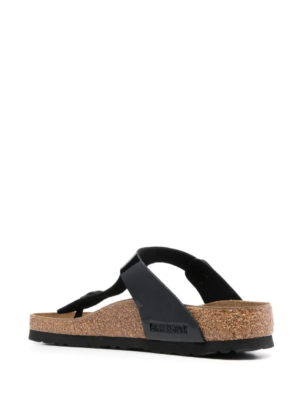 Gizeh single-toe strappy sandals from BIRKENSTOCK featuring jet black, calf leather, single toe strap, side buckle fastening, moulded footbed, branded insole, flat rubber sole, cork sole and Birko-Flor® Patent.